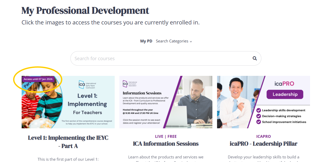 Additionally, you can look at the 'My Professional Development' section where you see all of the courses you are currently enrolled in on your 'My Home' page. If a course has an expiry date, it will show on the course image.