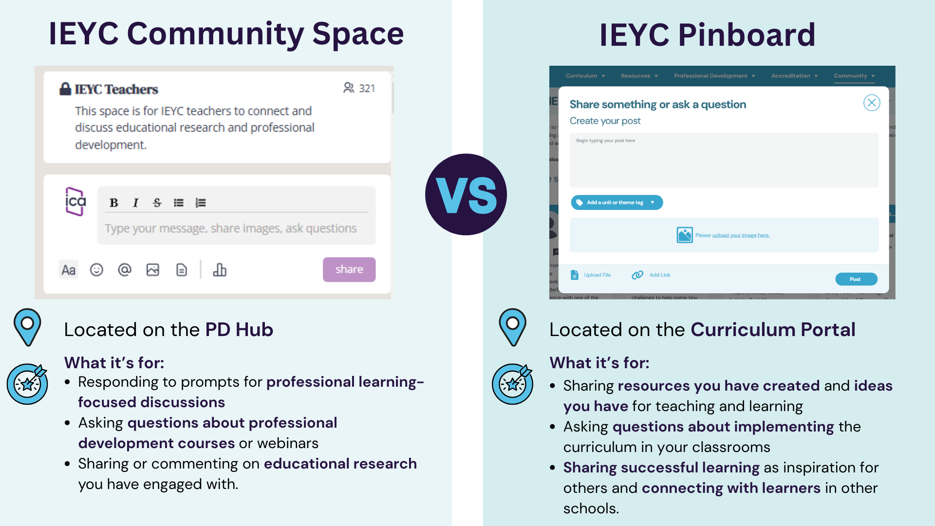 The Pinboard and the Teachers' Community spaces are intended to serve different functions, due to the differences in focus of the different platforms.